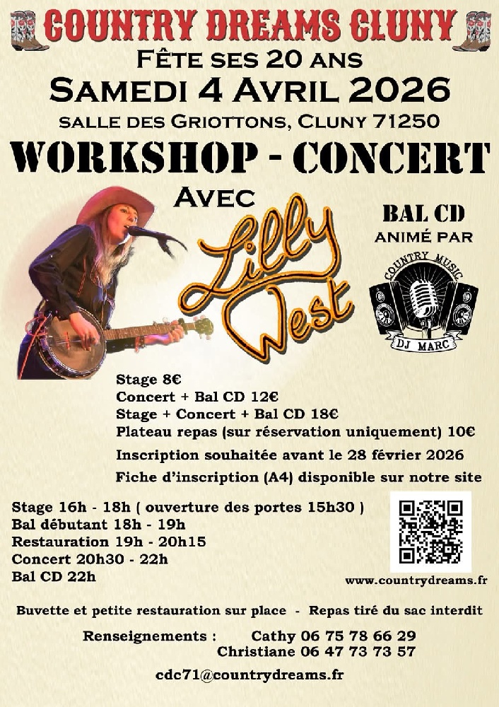 Renseignements et Réservations (obligatoire pour le stage, recommandées pour le concert) au 06 75 78 66 29 ou au 06 79 90 46 99 ou par email à cdc71@countrydreams.fr